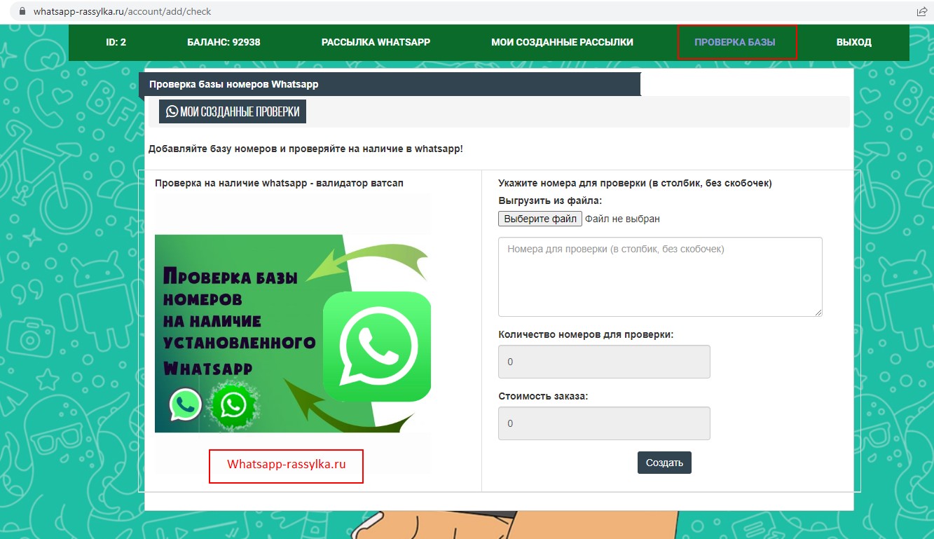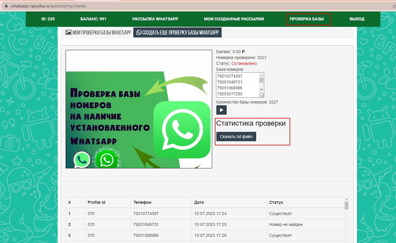 - Зайдите в раздел проверка базы , загрузите свою базу ( любое количество ) и получите отчет , на каких номерах установлен ватсап а на каких нет. Вы можете скачать , выгрузить базу на которых есть ватсап аккаунты